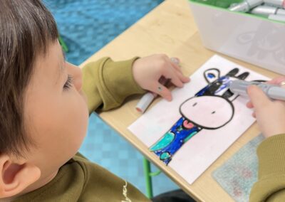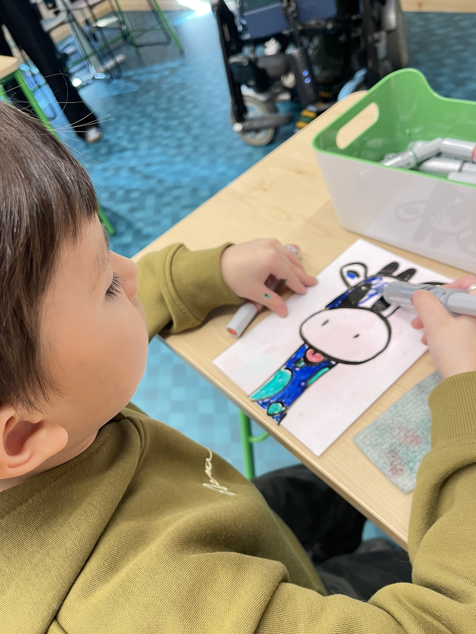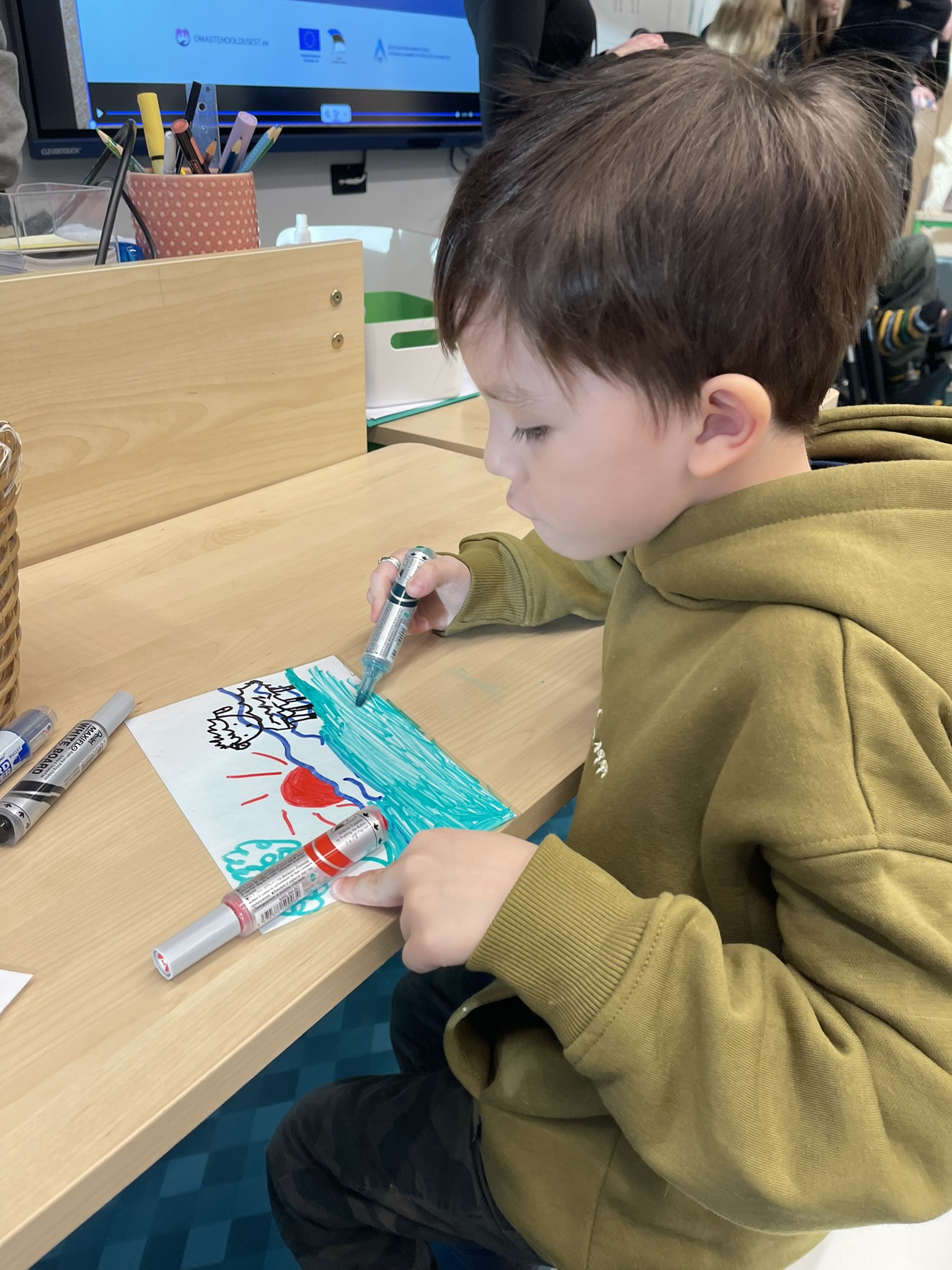 Kohale jõudes paigutasime maalid molbertitele ning lisasime sildid. Järgnes kohtumine kahe klassiga, kus alguses vaadati ühiselt üht videoklippi meie perest. Pärast seda kutsuti meie pere klassi, et õpilaste küsimustele vastata. Lisasime programmi loovuse arendamiseks ka ülesande, kus õpilased joonistasid seintel olevatele tahvlitele kaelkirjakuid, lambaid, päikeseloojanguid või tammepuid. Ülesanne kujunes väga meeleolukaks ja mul oli rõõm valida nende tööde seast enim meeldinud kujutis. Seejärel vaatasime õpilastega molbertitele paigutatud maale. Näitasin oma lemmikteost ja õpilased olid valinud enda lemmikud ning kommenteerisid, miks nad just selle valisid.